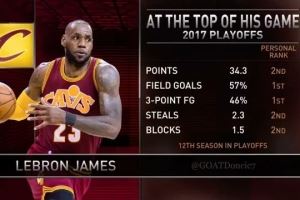 这是詹姆斯17年季后赛前七场的场均数据,骑士7胜0负。
