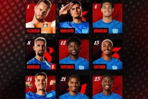 勒沃库森首发:1-弗莱肯、3-因卡皮耶、4-宽萨、8-安德里希、12-塔普索巴、13-阿图尔-奥古斯托、14-希克、21-阿明-阿德利、23-内森-泰拉、24-阿莱克斯-加西亚、30-马扎