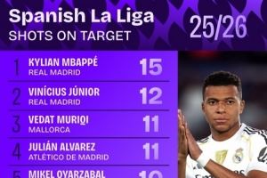 体育资讯10月7日讯 日前,Squawka统计了本赛季西甲射正次数排行,姆巴佩15次居首。