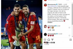 莫拉塔社媒晒出与阿尔巴在西班牙队的合照,并写道:“与你并肩作战、共享欢乐的时光何其珍贵,你总是充满快乐,旅途餐桌上欢声笑语不断。你是足球历史上最杰出的球员之一。”