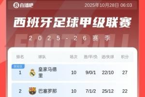 西甲10轮过后积分榜如图: